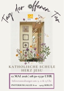 Herzliche Einladung zum Tag der offenen TürWir laden alle Eltern, die ihr Kind zum kommenden Schuljahr an der Herz Jesu Schule angemeldet haben, oder die ihr Kind für das darauffolgende Schuljahr anmelden möchten, herzlich zum Tag der offenen Tür am 12. Mai ein. Ab 8:30 Uhr können Sie sich ein Bild vom Unterrichtsalltag an unserer Schule machen. Um 9, 11 und 13 Uhr finden kurze Informationsveranstaltungen statt. Außerdem werden Schulführungen angeboten und es gibt bei Kaffee und Kuchen die Möglichkeit, mit Eltern der Schule ins Gespräch zu kommen. Wir freuen uns auf Ihren Besuch!